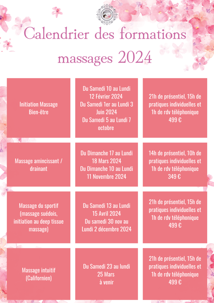 Une fois sur le site web, vous pouvez voir si l’organisme de formation organise des portes ouvertes ou des ateliers massages pour découvrir le lieu et les formateurs. Observez la qualité de la présentation de chaque stage : les dates, la présentation des formateurs, la clarté des objectifs de formation, des durées de formation et des modalités de règlement, de financement…Vérifiez s’il y a des prérequis pour les formations (avoir déjà fait une initiation massage, être déjà « du métier » ou aucun prérequis…)